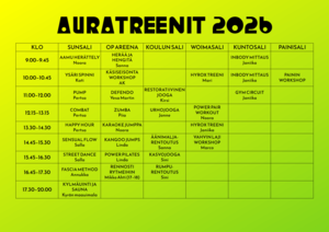 AuraTreenit järjestetään sunnuntaina 25.1.2025 kello 09-20 välisenä aikana. Voit hypätä päivään mukaan, kun sinulle parhaiten sopii. Voit jumpata yhden tunnin tai vaikka koko päivän. Tapahtuma paikkana toimii OP-Areena (Urpontie 2. Aura). SunSali (Huuskantie 19, Aura), Yhtenäiskoulun pikkusali (sama sisäänkäynti kuin OP-Areena), Woimasali Aura (Portinkaari1, Aura), Painisali Aurantalo (Oikokuja 6) ja Kyrön Maauimala (Ollilantie 12, Pöytyä).